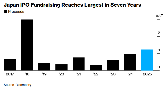 2025年日本股市首次公开募股(IPO)筹集了1.2万亿日元(约合77亿美元)的资金,为2018年以来的最高水平。其中,JX先进金属公司和SBI新生银行等公司的IPO规模达数十亿美元,包括日本明星设计师Nigo投资的品牌Human Made和冲绳啤酒制造商Orion Breweries在内的部分IPO则获得了超过60倍的超额认购。