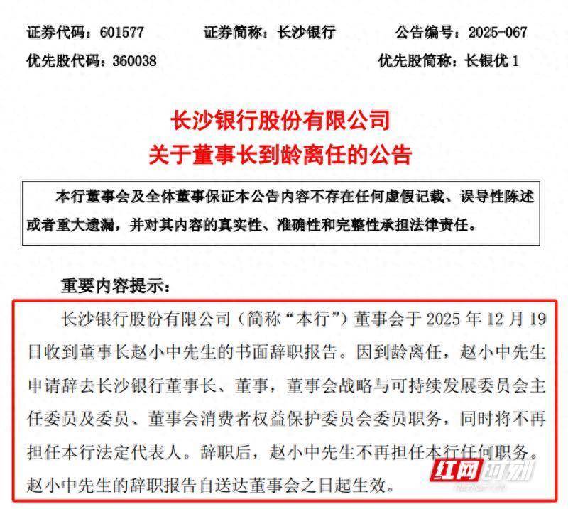 公告中,长沙银行给予赵小中高度评价,称其“见证参与了该行从无到有、发展壮大的全过程”。在其董事长任内,长沙银行相继实现获批基金托管资格、完成湖南县域机构全覆盖、资产规模突破万亿、行业排名进入全球200强等多项成就。