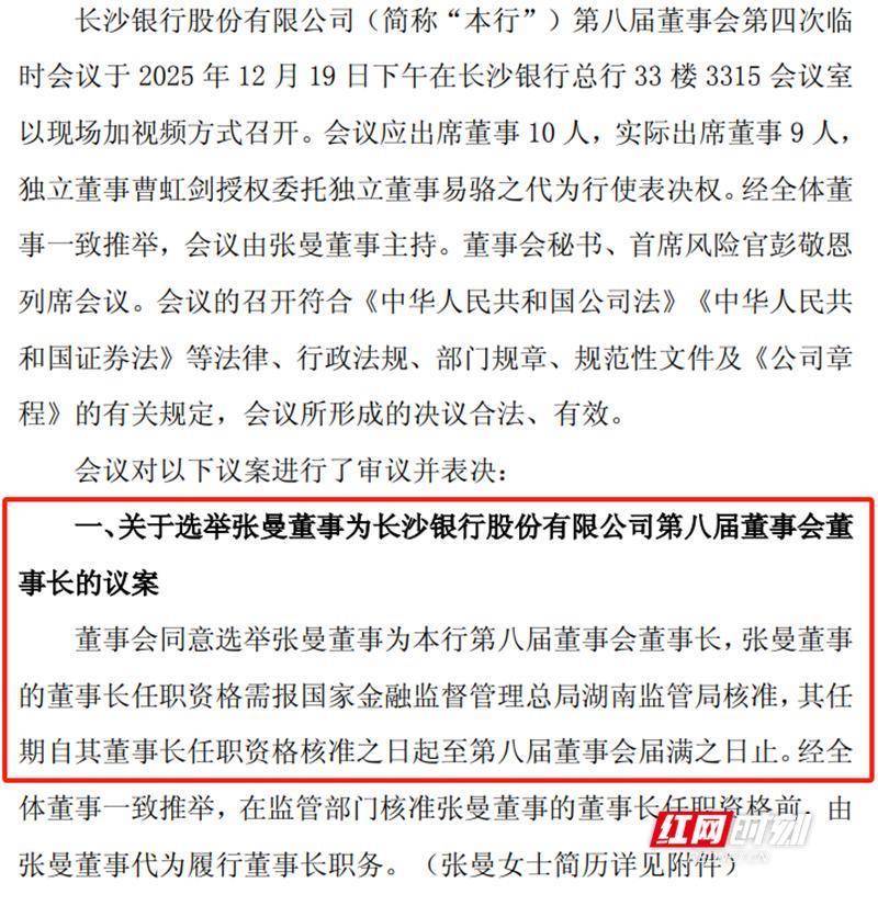公告显示,张曼的董事长任职资格尚需报国家金融监督管理总局湖南监管局核准,在此期间,董事会一致推举其代为履行董事长职务。
